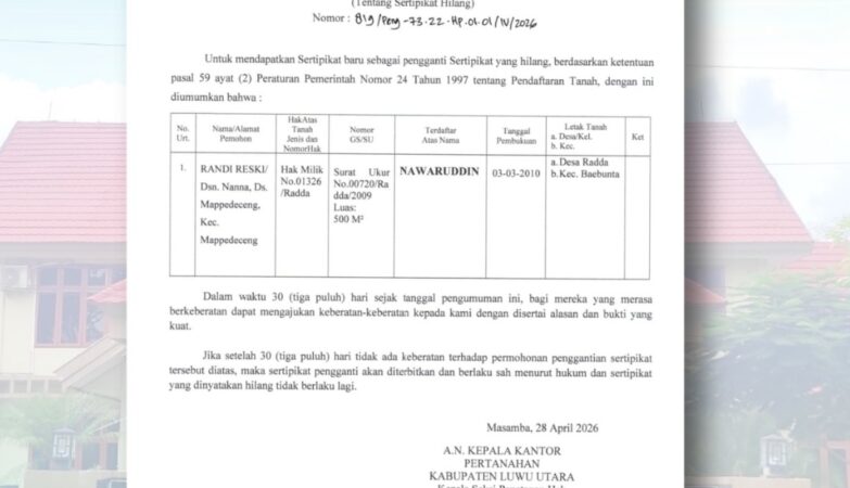 BPN Luwu Utara, Umumkan Sertifikat Hilang Demi Jaminan Kepastian Hukum Secara Terbuka Dan Transparan