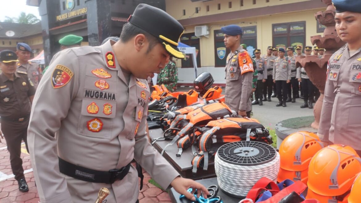 Kapolres Luwu Utara AKBP Nugraha Pamungkas serahkan perahu rakitan dan cek kelengkapan SAR milik polres, brimob, dinas sosial dan basarnas dalam Apel Gelar Pasukan dalam rangka Siaga Penanggulangan Bencana di Wilayah Hukum polres Lutra, Jumat (3/10/2025).