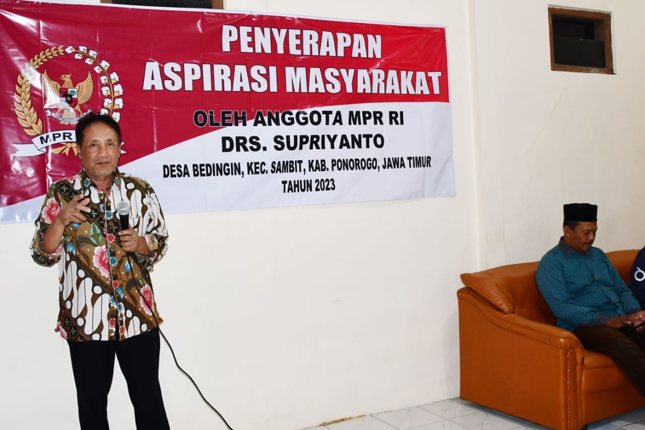 PONOROGO – Anggota MPR/DPR RI dari Fraksi Partai Gerindra, Drs. Supriyanto melakukan kegiatan penyerapan aspirasi masyarakat bersama warga Desa Bedingin, Kecamatan Sambit, Kabupaten Ponorogo, Jatim pada 7 Juli 2023 silam.