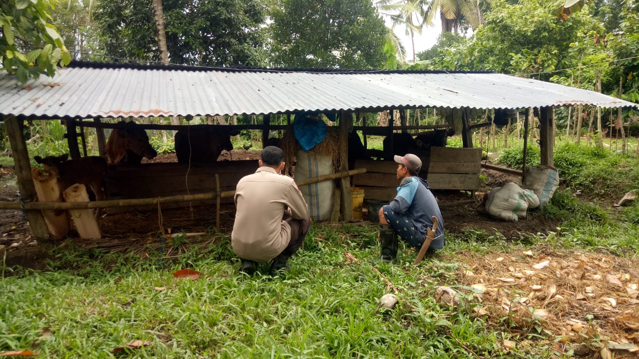 Selain melakukan pengecekan terhadap hewan ternak milik warga, Bhabinkamtibmas juga memberikan edukasi dan sosialisasi terkait PMK (Penyakit Mulut dan Kuku) kepada pemilik ternak.