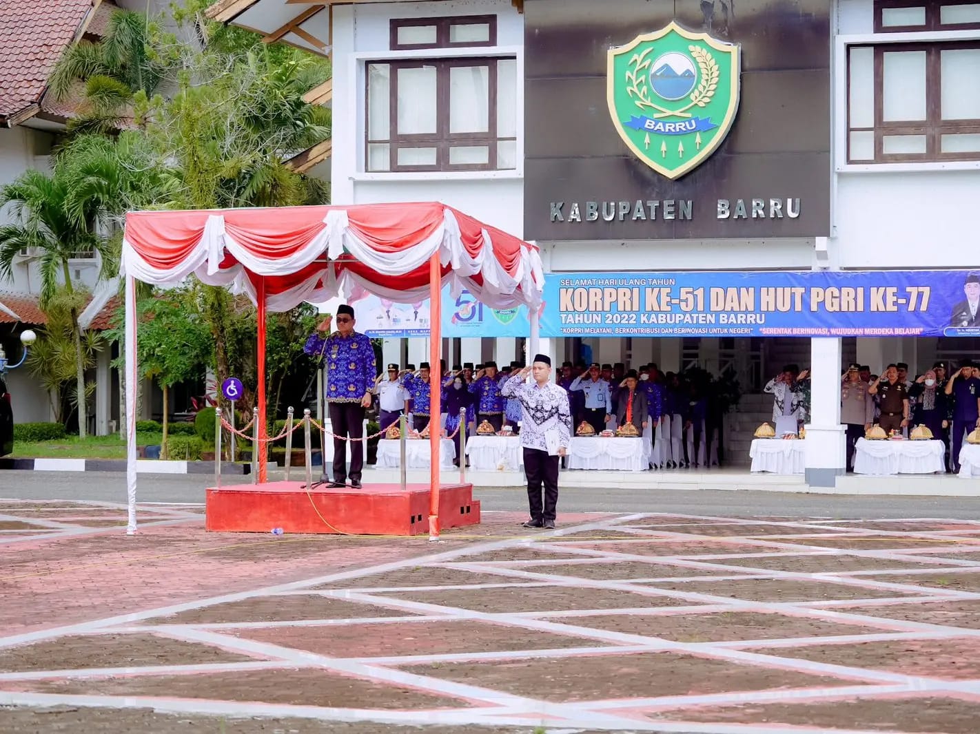 BARRU- Pemerintah Daerah (Pemda) Barru menggelar upacara peringatan Hari Ulang Tahun (HUT) Korps Pegawai Republik (KORPRI) ke 51 tahun dan Hari Guru Nasional tahun 2022, di halaman kantor Bupati Barru, Selasa (29/11/2022).