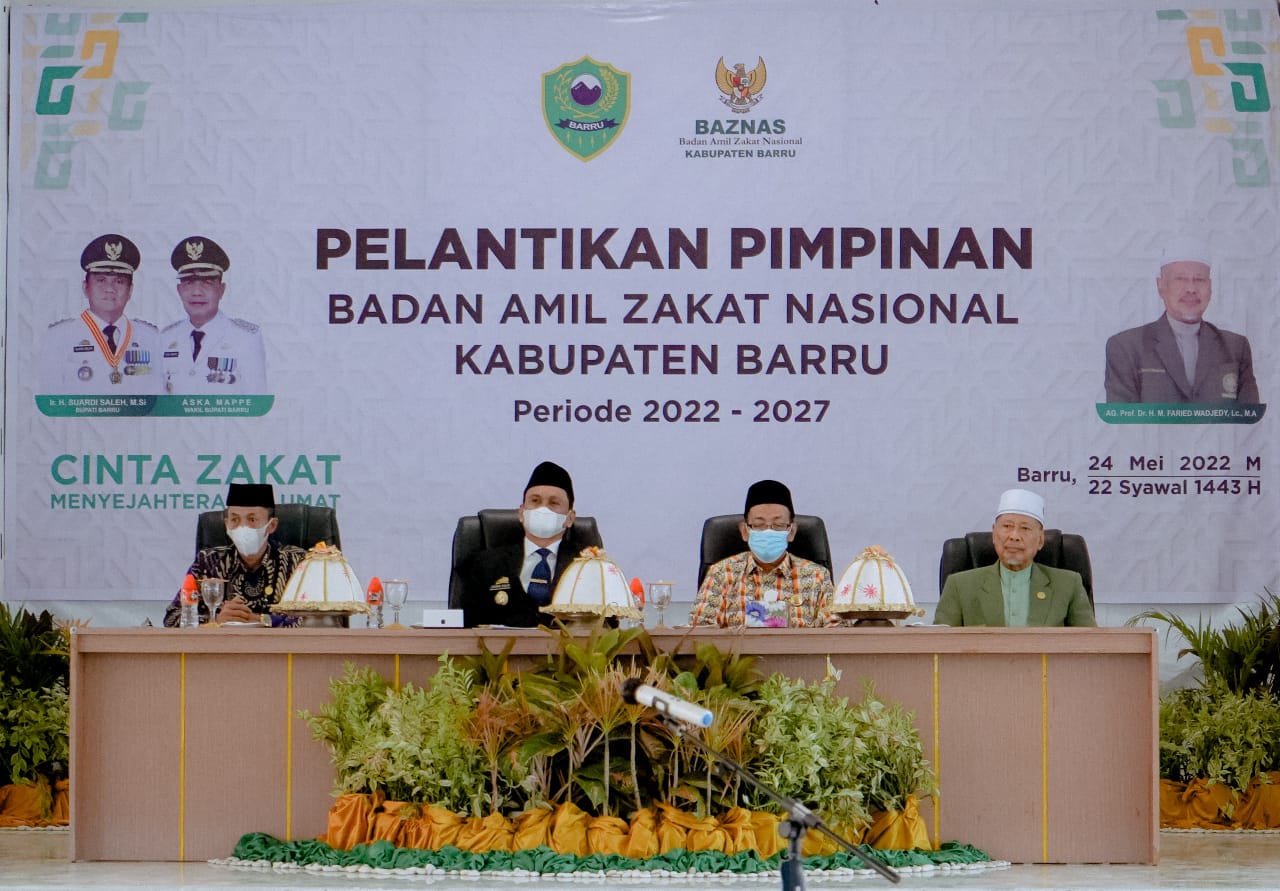 BARRU, Bupati Barru H.Suardi Saleh melantik Pimpinan Badan Amil Zakat Nasional (Baznas) Kabupaten Barru Provinsi Sulawesi Selatan periode 2022-2027, di Gedung MPP Lantai 6 Kantor Bupati Barru, Selasa (24/5/2022).