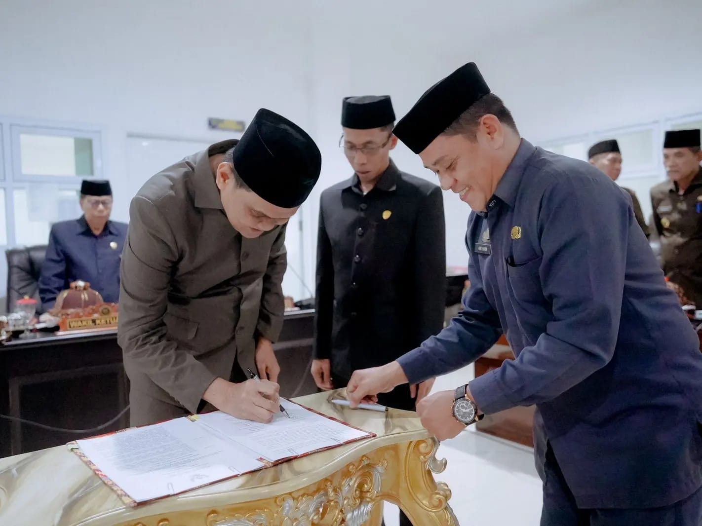 Barru – Bupati Barru H. Suardi Saleh bersama Ketua DPRD Barru Lukman T menandatangani persetujuan bersama pengesahan APBD Tahun Anggaran 2023, pada Rapat Paripurna Tingkat II DPRD di gedung DPRD Barru, Jumat 25/11/2022.