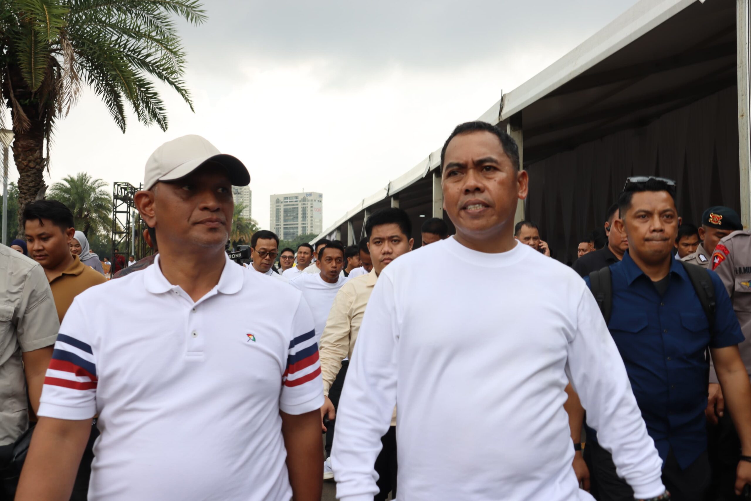 Bupati dan Wakil Bupati Wajo terpilih Andi Rosman-Baso Rahmanuddin mengikuti gladi kotor pelantikan bersama ratusan kepala daerah terpilih dari seluruh Indonesia di halaman Monumen Nasional (Monas), Jakarta Pusat, Selasa (18/02/2025)