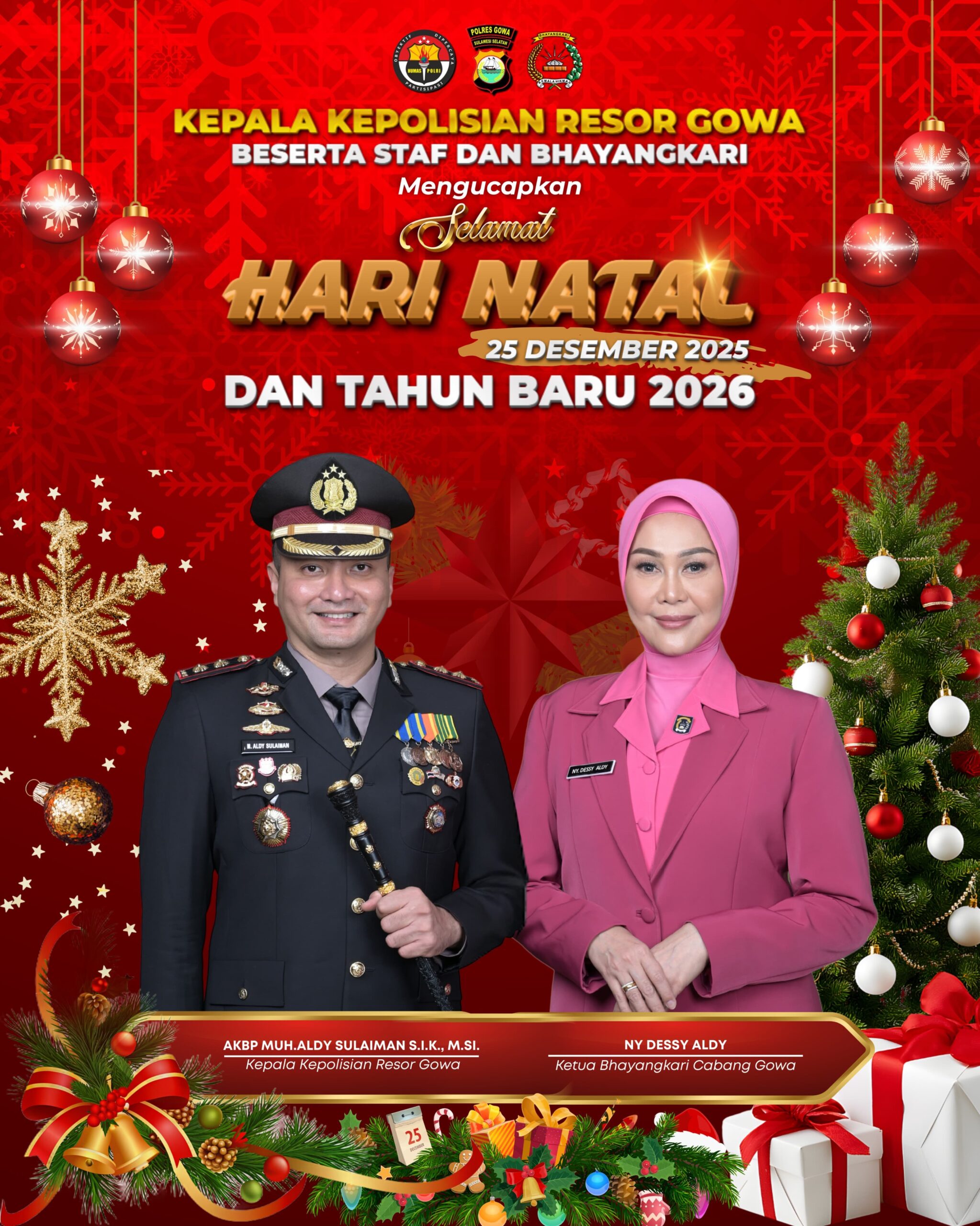 Kepala Kepolisian Resor Gowa AKBP Muhammad Aldy Sulaiman, S.I.K, M.Si beserta seluruh staf dan Bhayangkari Cabang Gowa menyampaikan ucapan Selamat Hari Raya Natal 25 Desember 2025 dan Selamat Menyongsong Tahun Baru 2026 kepada seluruh umat Kristiani serta masyarakat Kabupaten Gowa, Kamis (25/12/2025).