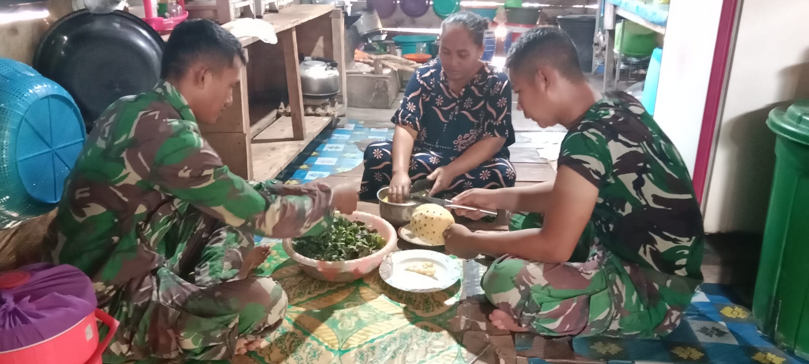 Seperti yang dialami Pratu Alven dan Prada Rendi angggota Satgas dari Yonif 725/Woroagi membantu memasak bersama Ibu Karniwati (43) di Kel. Tombula (26/9/2023).