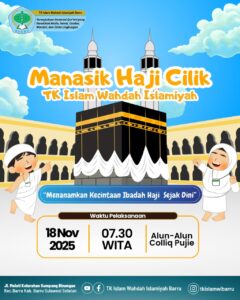 BARRU,– TK Islam Wahdah Islamiyah Barru sukses melaksanakan kegiatan Manasik Haji Cilik pada hari Selasa, 18 November 2025. Acara edukatif ini digelar di Alun-Alun Colliq Pujie, Barru, mulai pukul 07.30 WITA, dengan mengusung tema “Menanamkan Kecintaan Ibadah Haji Sejak Dini”.