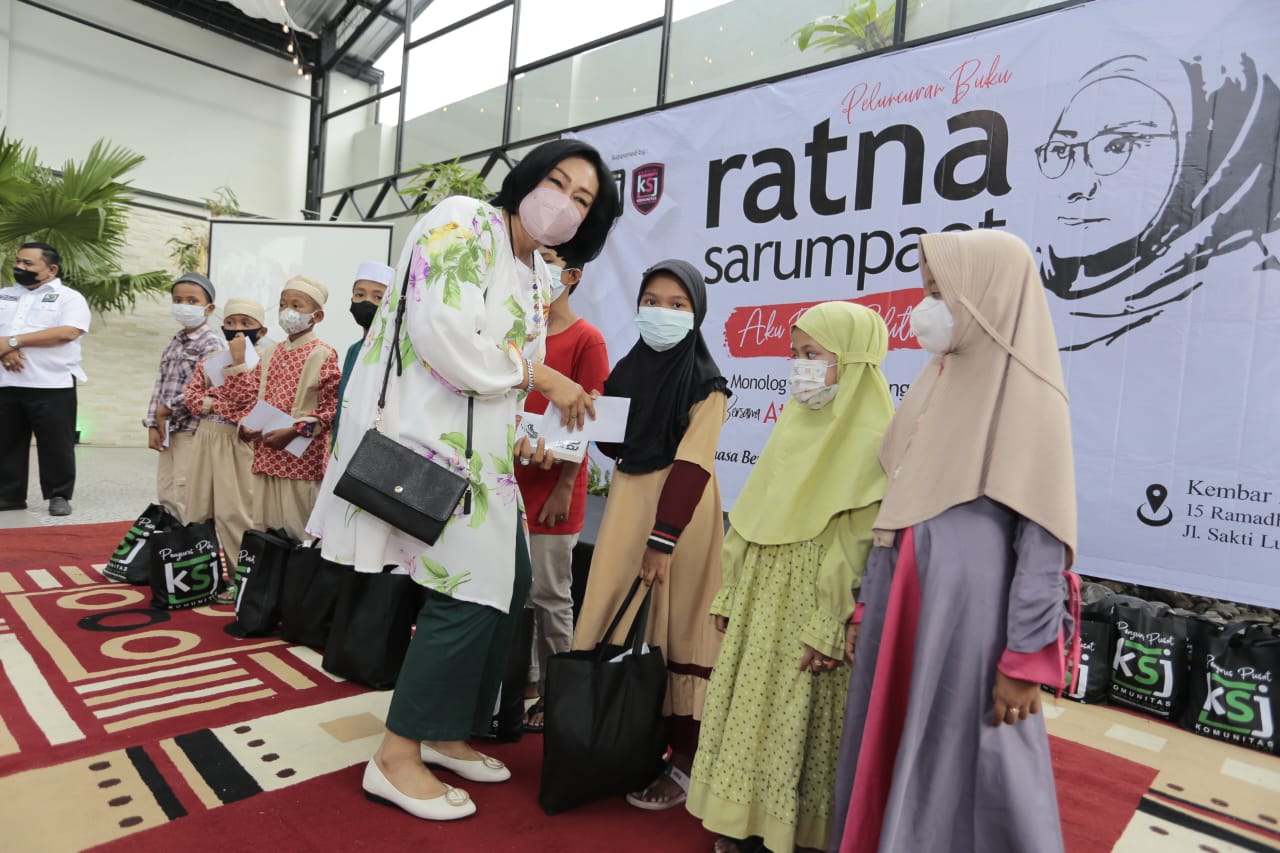 Selanjutnya Ibunda Ratna Sarumpaet dan Mbak Atiqah Hasiholan bersama keluarga besar Komunitas Sedekah Jum’at (KSJ) menyantuni Anak-anak Yatim-piatu secara simbolis.