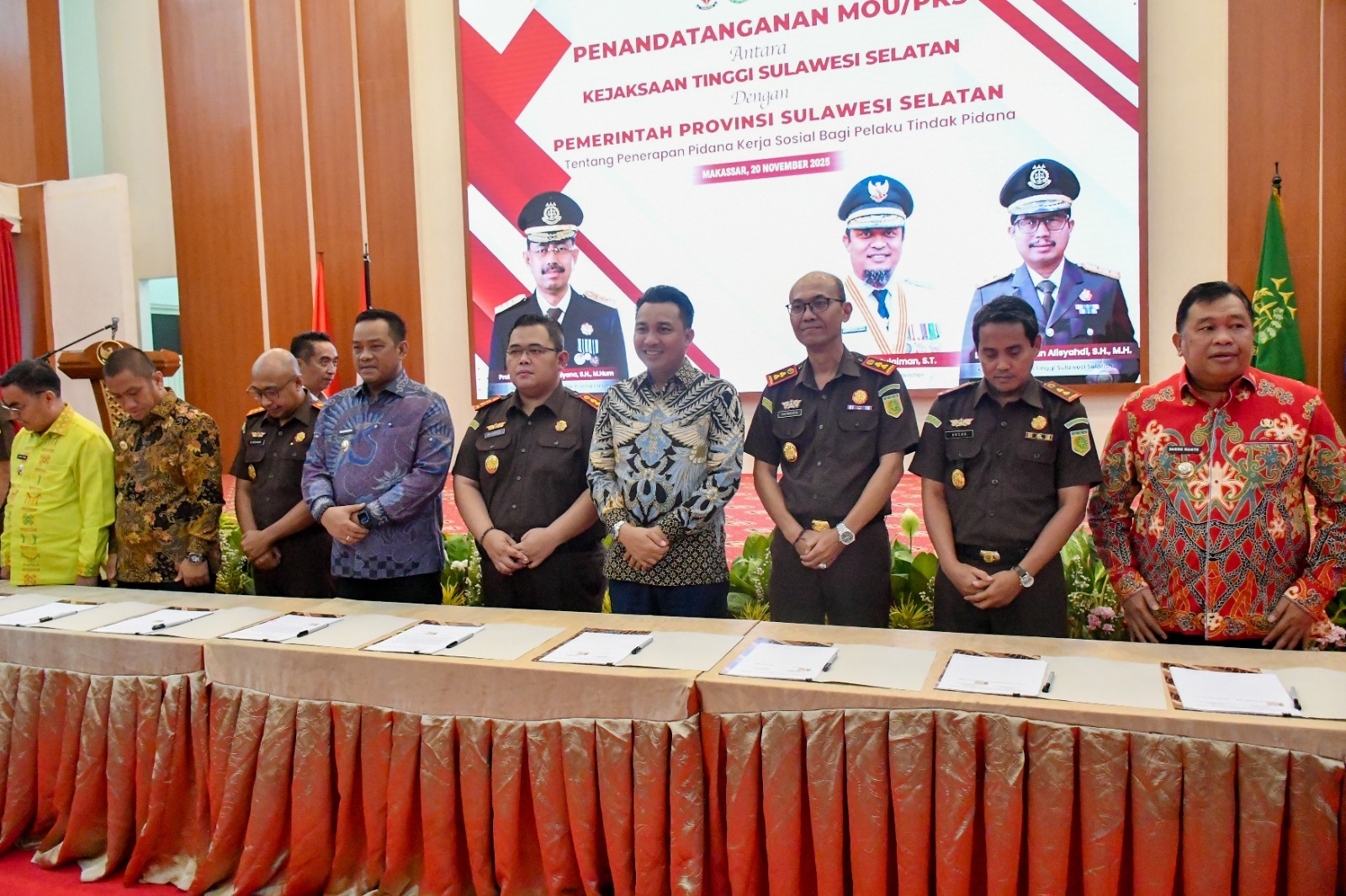 Penandatanganan MoU dan PKS terkait Penerapan Pidana Kerja Sosial bagi Pelaku Tindak Pidana Ringan di Wilayah Sulawesi Selatan ini dilakukan di Baruga Asta Cita Rumah Jabatan Gubernur Provinsi Sulawesi Selatan di Makassar, Kamis ( 20 November 2025 ).