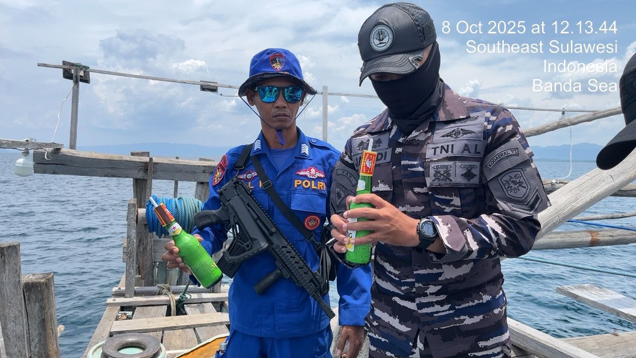 Personel Direktorat Polairud Polda Sultra melaksanakan kegiatan patroli gabungan bersama Tim gabungan Dinas Kelautan dan Perikanan (DKP) Provinsi Sulawesi Tenggara pada tanggal 8 Agustus 2025 di perairan Pulau Bokori, Kabupaten Konawe.