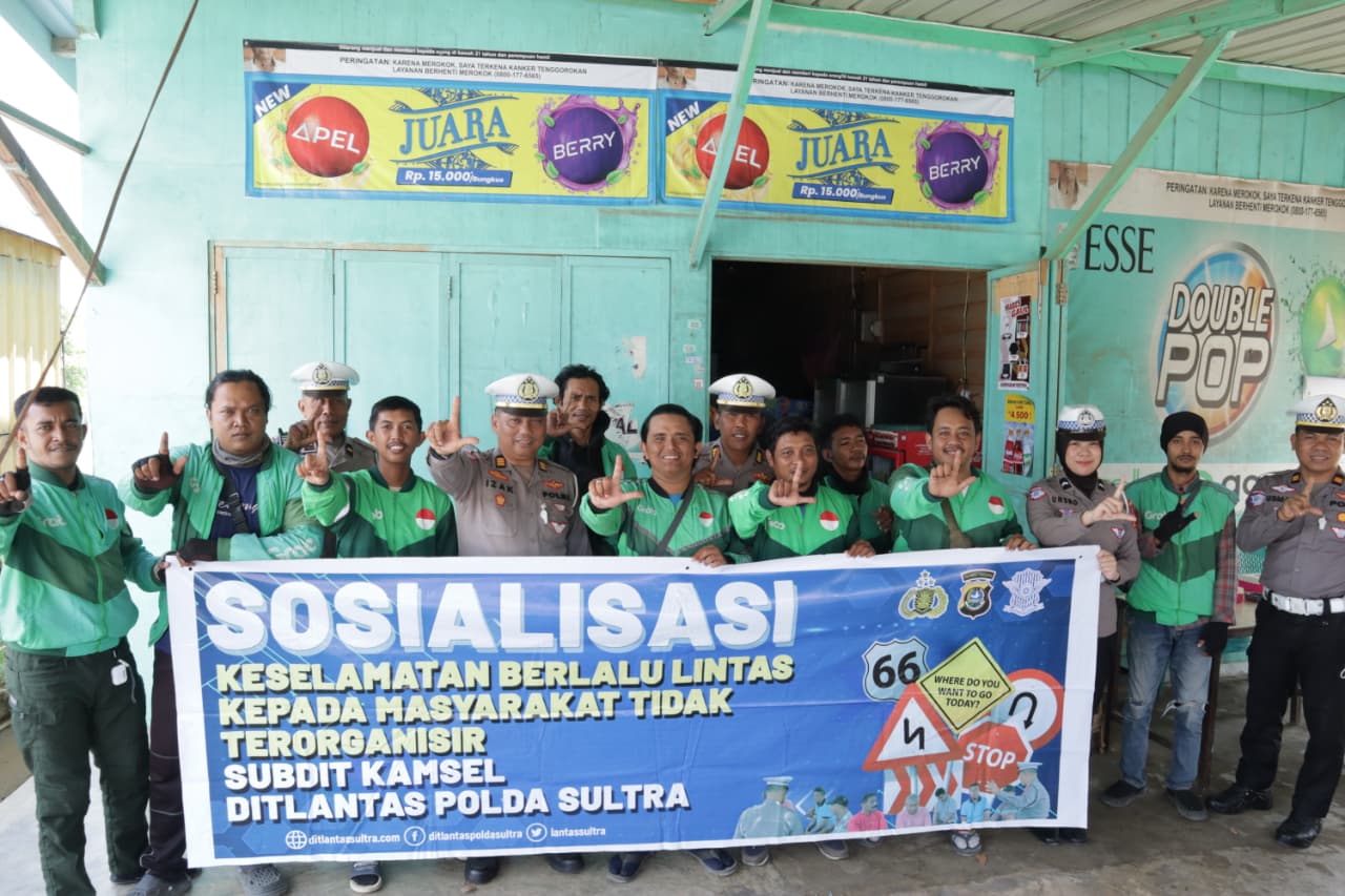 Kendari – Direktorat Lalu Lintas (Ditlantas) Polda Sulawesi Tenggara melalui Subdit Keamanan dan Keselamatan (Kamsel) menggelar kegiatan “Polantas Menyapa” dengan sasaran para pengemudi ojek online dan masyarakat di sekitar Pangkalan Ojek Pasar Lawata dan Pangkalan Grab, Selasa (23/9/2025) pagi.