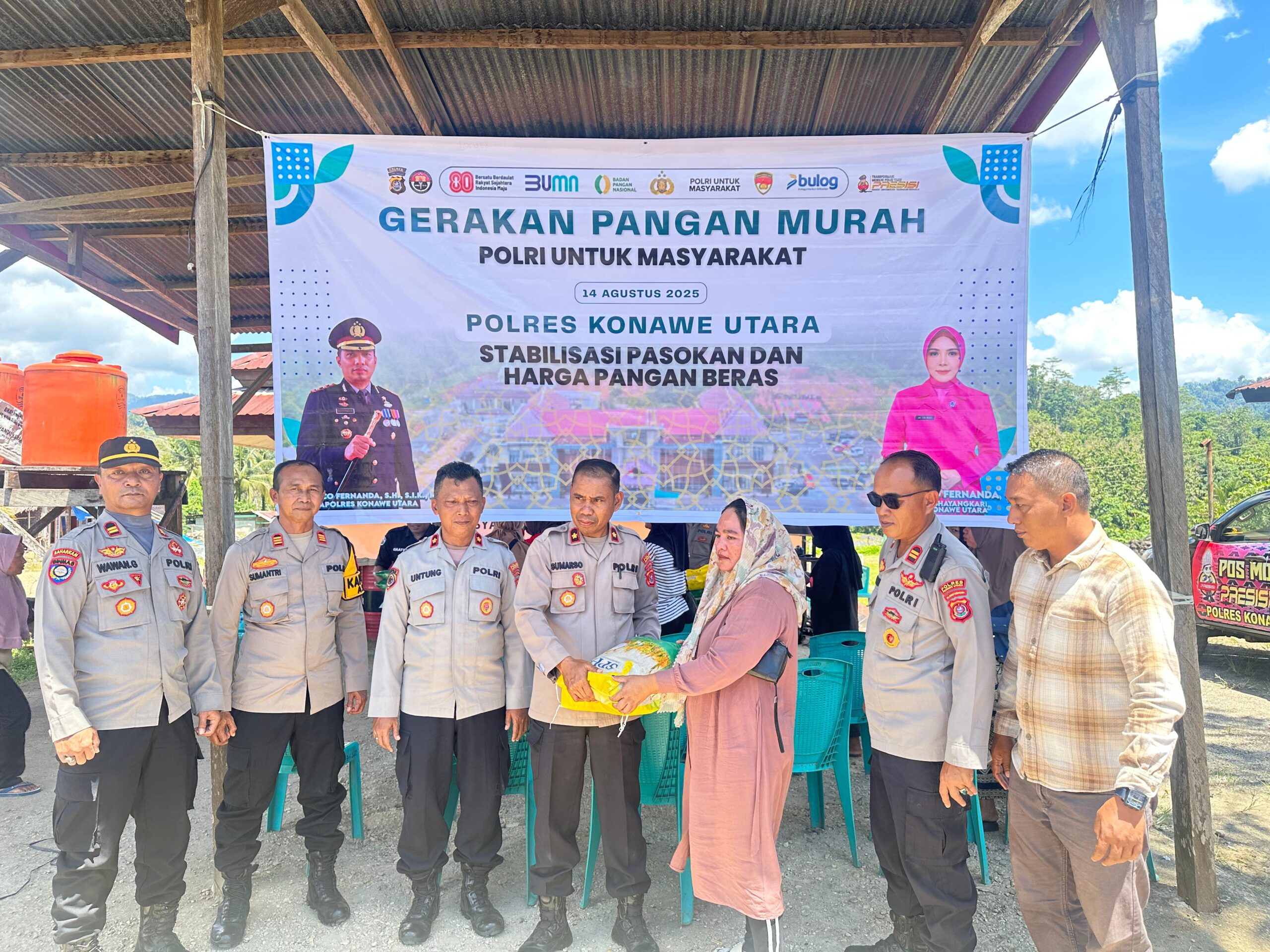 KONAWE UTARA – Polres Konawe Utara bekerja sama dengan Perum Bulog Kanwil Sultra menggelar Gerakan Pangan Murah di halaman Mako Polsek Asera, Kelurahan Wanggudu, Kecamatan Asera, Kamis (14/8/2025) pukul 11.00 WITA. Kegiatan ini menjadi wujud kepedulian Polri kepada masyarakat dalam menjaga stabilitas pasokan dan harga pangan, khususnya beras ungkap Kapolres Konawe Utara AKBP Rico Fernanda, S.H., S.IK., M.H melalui Wakapolres Kompol Sumarso.