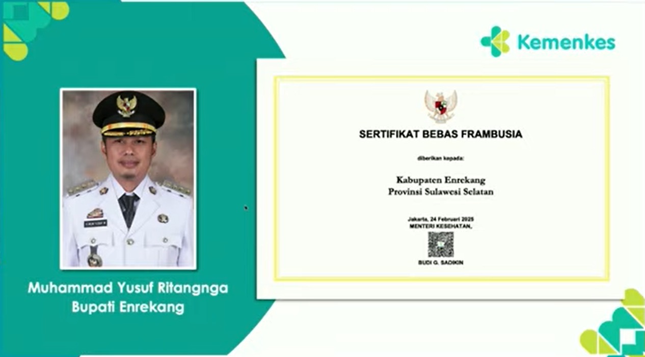Enrekang Sulsel // Tipikor RI. Pemerintah Kabupaten Enrekang menerima sertifikat Bebas 2025 Frambusia dari Kementrian Kesehatan, Rabu, 20 Agustus 2025. Penyerahan ini dilakukan secara daring.