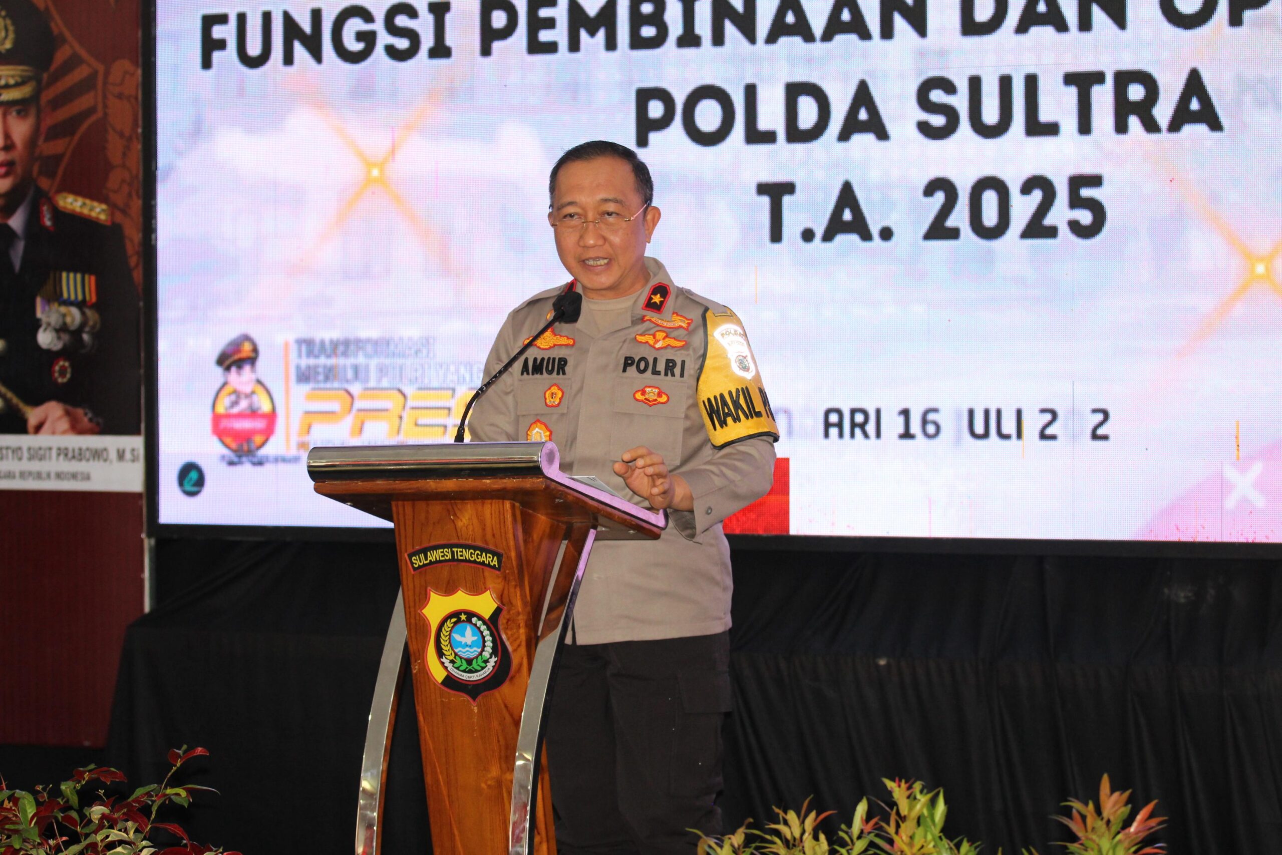 Kendari – Wakapolda Sulawesi Tenggara, Brigjen Pol Amur Chandra Juli Buana, S.H., M.H., secara resmi membuka Rapat Kerja Teknis (Rakernis) gabungan fungsi pembinaan dan operasi Polda Sultra, yang dilaksanakan di Aula Dachara Mapolda Sultra pada Rabu, 16 Juli 2025.